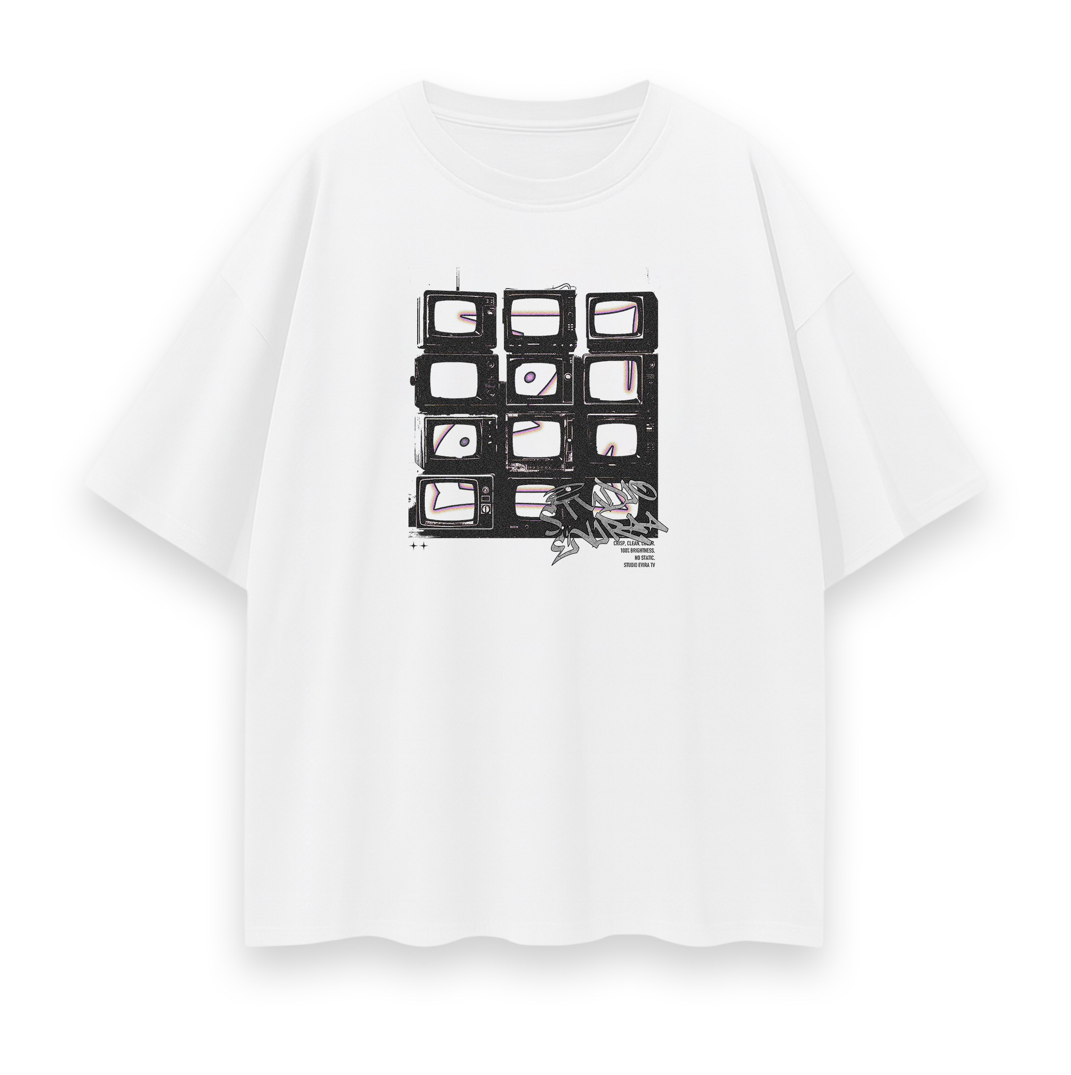 - TV stack artwork with Evira 'E' logo embedded, printed on front chest piece
